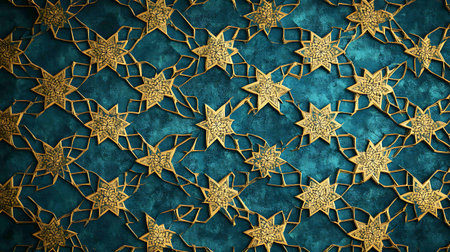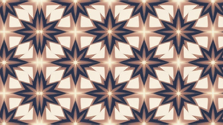 A repeating geometric pattern of navy blue starbursts with a beige background and golden light effects.