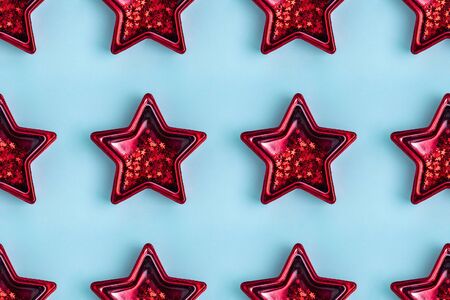 Seamless pattern from five pointed red metallic star on pastel blue surface. Shining decoration.