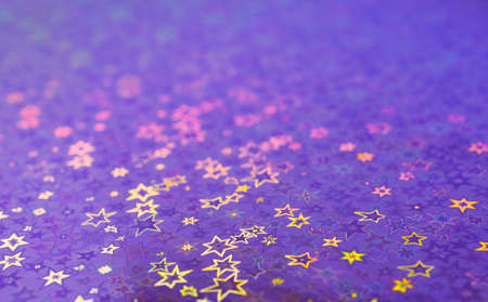 Sparkling golden glitter abstract background purple blue yellow desaturated color, fluid defocused, macro. Sequins sparkling over foil silver stars. party festive celebration background