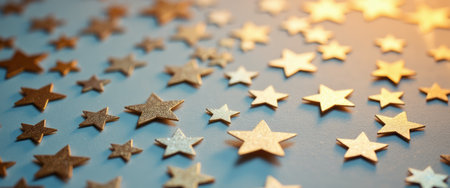 A scattering of golden star-shaped confetti creates a festive and celebratory atmosphere against a dark background, perfect for holiday themes.