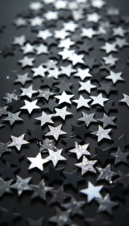 A dazzling array of black and silver star-shaped confetti glimmers against a deep black background, creating a festive and magical atmosphere. This captivating scene evokes feelings of celebration and wonder, perfect for party decorations or creative projects.