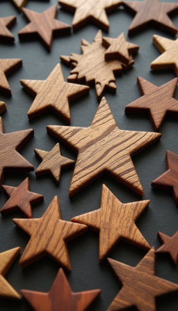 A stunning collection of wooden stars in various sizes and shapes creates a captivating visual display against a deep black backdrop. The rich textures and warm tones of the wood evoke a sense of warmth and creativity, perfect for holiday decorations or artistic projects.