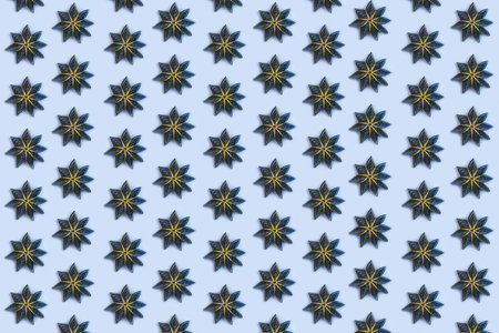 Christmas bauble abstract pattern on blue background. Black paper snowflake shape toy, New Year decorations. Top view, flat lay, wallpaper.
