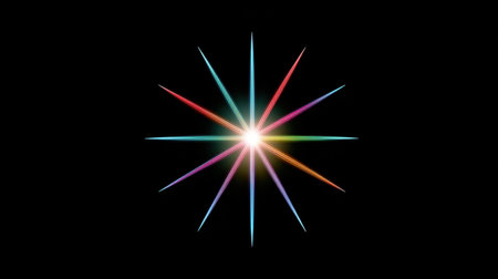 Bright lens flare with vibrant colors radiating from a central white light source on black