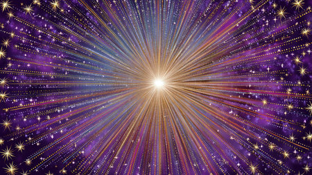 This vibrant cosmic explosion captures light radiating from a central point, surrounded by colorful stars against a deep purple background. Perfect for abstract art.