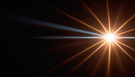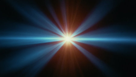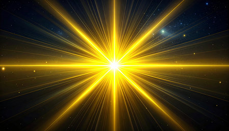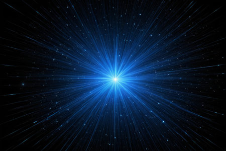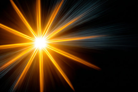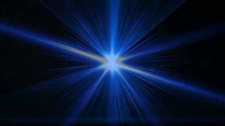 An abstract illustration features a central starburst element emitting bright light. The image showcases dynamic light rays in shades of blue and gold against a dark backdrop. The composition suggests motion and energy, suitable for commercial projects, promotional materials, and various editorial applications.