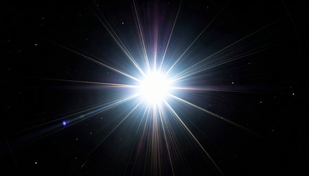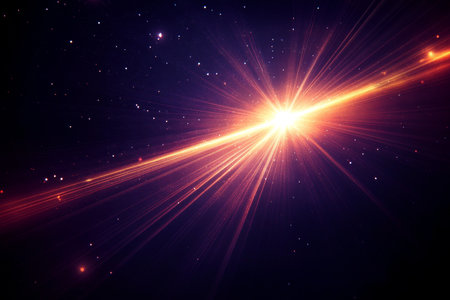 Abstract depiction of bright white and golden light streaks and flares radiating outwards in a dark, particle-filled space, suggesting energy or a...