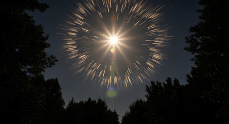 Dazzling explosion of light radiates outward, creating mesmerizing display of shimmering particles against dark background. This captivating visual evokes feelings of wonder and excitement