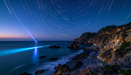 As the Earth turns, the night sky paints swirling trails of starlight above a rugged coastline.