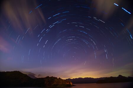 Stars move around the pole star at night. long exposure. Dark blue background and colored lines in a circle