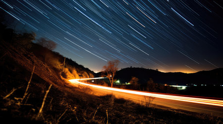 Night landscape with a winding road in the mountains, traces from the headlights of cars and stars in the form of tracks in the sky