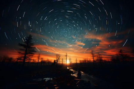 Generative AI : Night sky over lone tree with circular star trails centered and symmetrical composition