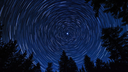 Long-exposure shot of star trails circling the North Star, creating a mesmerizing pattern in the night sky.