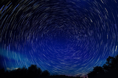 Long exposure photo capturing the mesmerizing trails of shooting stars circling the celestial pole