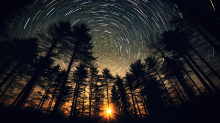 Generative AI : Long exposure star trails in the night sky against the background of tree crowns in the forest