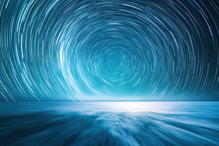 night sky with swirling blue star trails above Earth's horizon, creating a dynamic and cosmic visual effect.