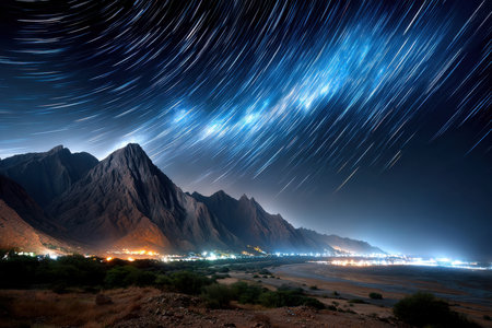 astrophotography with long exposure to capture star trails over a captivating landscape