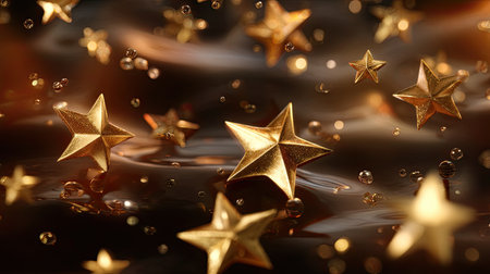 This captivating image features golden stars gracefully floating against a dark, textured background, enhanced by shimmering effects and sparkling elements.