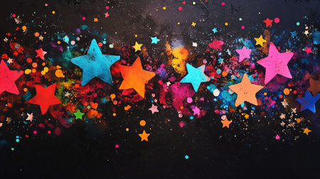 A vibrant collection of colorful stars and paint splashes forms a whimsical background, perfect for creative projects and artistic expressions. Ideal for design and illustration.