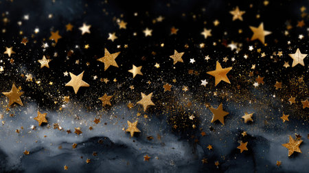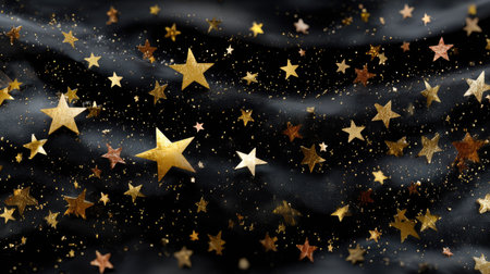 A dazzling array of shimmering golden stars and confetti glimmers against a deep, dark background, creating a festive and celebratory atmosphere. This enchanting scene captures the essence of joy and celebration, perfect for New Years Eve or any special occasion.