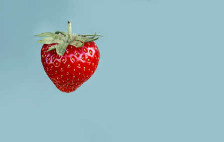 One strawberry berry red ripe sweet on a gray background close-up with a copy space.