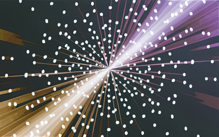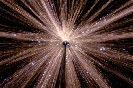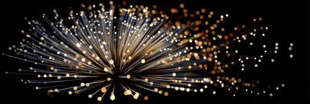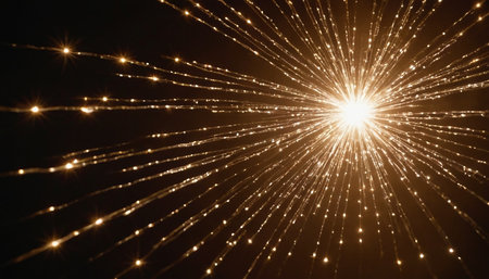 Dazzling explosion of light radiates outward, creating mesmerizing display of shimmering particles against dark background. This captivating visual evokes feelings of wonder and excitement