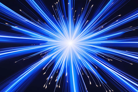 A dynamic burst of blue and orange light beams, creating a vibrant, abstract display of motion and energy.