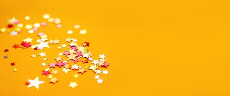 Yellow holiday background with colorful star confetti. Good background for Christmas and New Year cards.