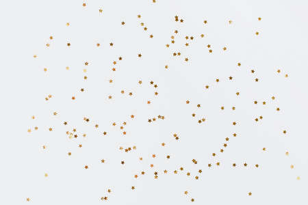 Confetti in the shape of stars poured out glasses. Christmas and new year background. Top view.