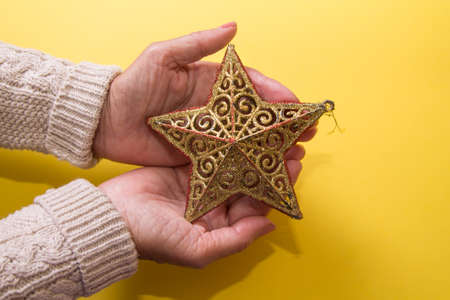 Christmas star decor in women hand. Christmas greeting card. Woman's hands hold christmas or new year decorated gift.
