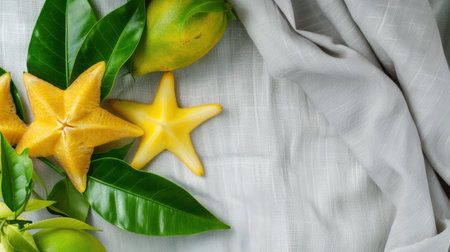 A visually appealing display featuring starfruit and vibrant green leaves against a soft gray fabric backdrop, ideal for highlighting healthy eating.