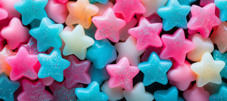 Brightly colored star-shaped candies in pink, blue, and white are spread out across a surface, creating a cheerful, festive atmosphere perfect for parties or special occasions.