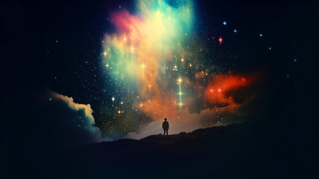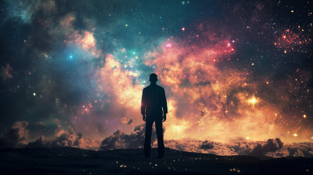 Silhouette of a man contemplating the beauty of a colorful cosmic nebula in space