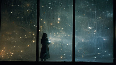 A woman stands in a dimly lit space, her profile aglow with shimmering lights and vibrant particles, creating a dreamlike atmosphere that captivates the viewer's imagination.