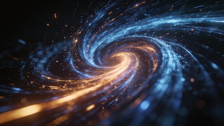Luminous blue spiral vortex with glowing light trails and cosmic star-like particles in motion