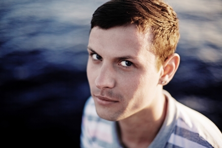 beautiful dark-haired guy portrait in gloomy day. High quality photo