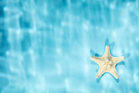 White Starfish on blue background with underwater ripped shadows, top view, copy space