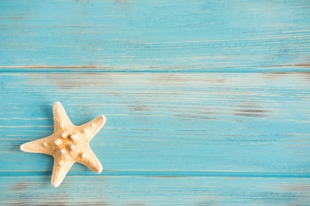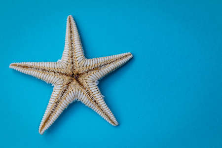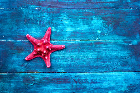 Caribbean starfish on a blue wooden background, flat lay