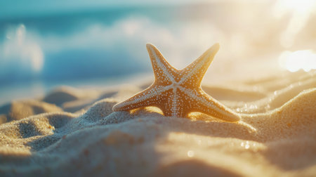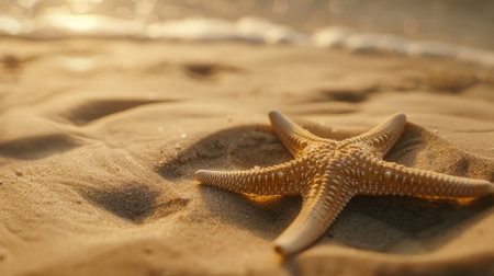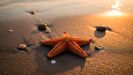 A serene beach scene featuring a starfish resting on soft sand, illuminated by the golden light of sunset. Gentle waves create a tranquil atmosphere.
