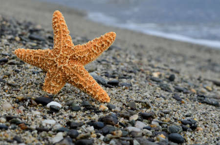 Orange starfish on a grey sand background