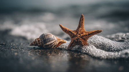 A close-up captures a starfish and a seashell resting on a wet surface with gentle wave action. The image displays warm tones from the starfish contrasted with cool hues of the water. This photo presents a natural environment, potentially suitable for various commercial or editorial uses.