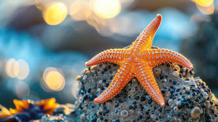 A stunning close-up image features a vibrant starfish resting on wet rocks, illuminated by a gentle sunrise. This scene captures the beauty of marine life and the peaceful coastal environment, perfect for nature lovers and beach enthusiasts.