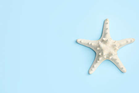 Beautiful sea star on light blue background, top view. Space for text