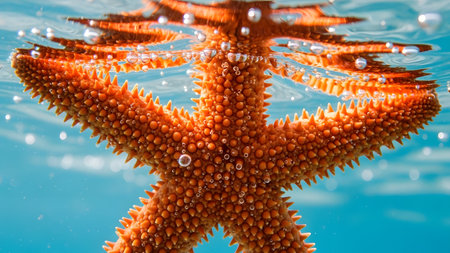Beautiful orange starfish gracefully floats in clear blue ocean water, capturing the elegance of marine life and the tranquility of underwater environments. Ideal for nature enthusiasts.