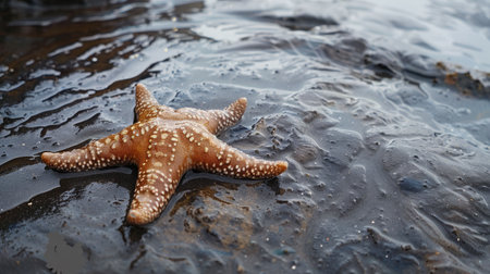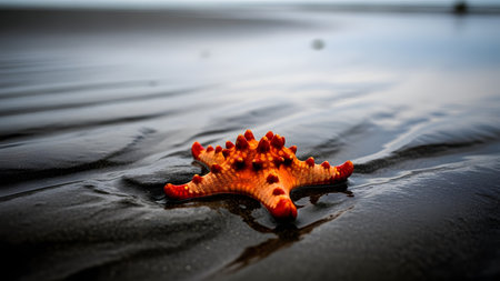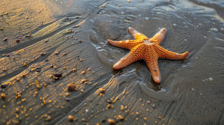 A stunning close-up of a starfish resting on the wet sand by the shore, illuminated by soft sunlight, showcasing nature's beauty and marine diversity.