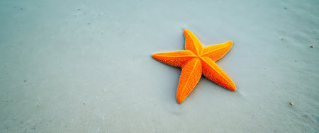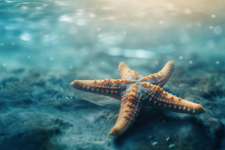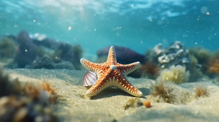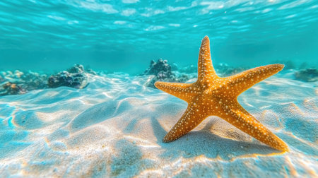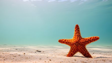 A stunning bright starfish rests peacefully on a sandy ocean floor, illuminated by clear blue water, reflecting summer's warm embrace and tranquility.