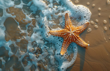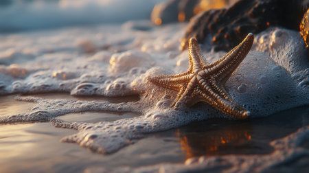 A serene beach scene featuring a starfish resting on wet sand, surrounded by gentle waves and foamy water, capturing the beauty of marine life at sunset.
