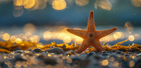 Beach sunset and starfish, soft yellow-blue sunlight with beautiful sun reflections on golden sand, copy space for text