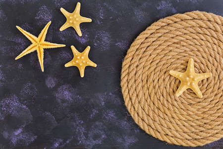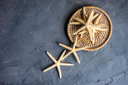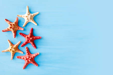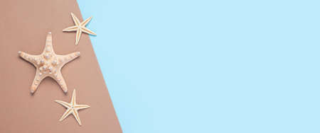 Starfishes on a brown-blue background. Top view, flat lay. Banner