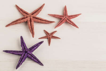 Starfishes on a brown background. Beach and vacation concept. Global warming. Banner. Flat lay, top view.